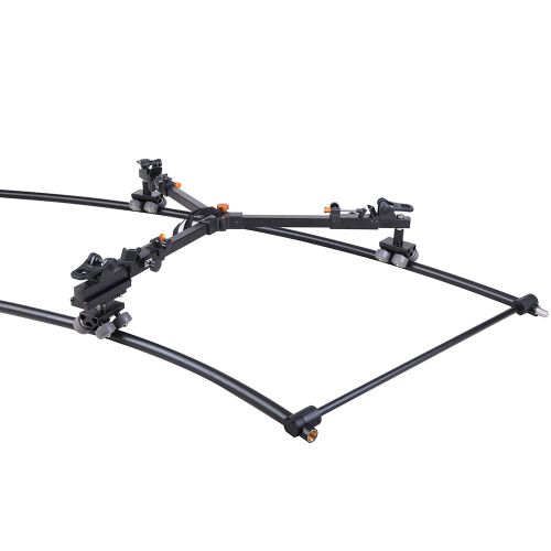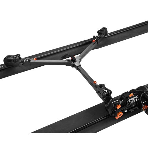 На тележку можно устанавливать штативы как с плоскими опорами, так и с шипами с максимальным весом 50 кг. И в первом, и во втором вариантах ноги трипода надежно фиксируются специальными замками. Сами замки расположены на скользящих скобах, которые можно перемещать вдоль секций тележки и фиксировать в необходимом месте. Тележка рельсовой системы для видеосъемки E-Image ED330 легко складывается/раскладывается и надежно фиксируется в рабочем виде при помощи винта по центру.