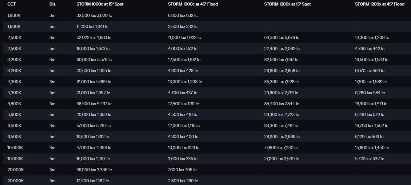 Максимальная яркость освещения: 61 000 люкс при 4300K на 3 м с моноблоком STORM 1000c.