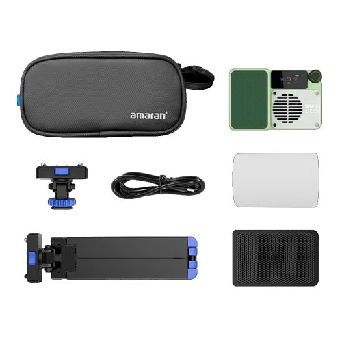 В этом наборе есть накамерный LED свет RGB amaran Ace 25c в корпусе зеленого цвета и самые необходимые аксессуары для видеосъемки.